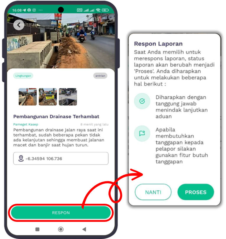 - Pada kotak dialog yang muncul klik tombol Nanti apabila Anda tidak jadi merespon laporan dan klik tombol Proses apabila Anda ingin mulai merespon laporan warga.