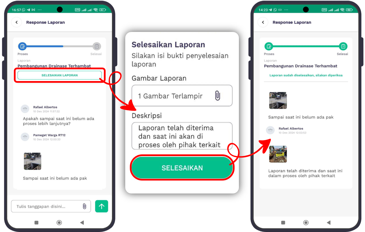 Untuk laporan yang sudah diproses, klik Selesaikan Laporan. Isi kolom Deskripsi, dan jika perlu, unggah gambar bukti penyelesaian.
