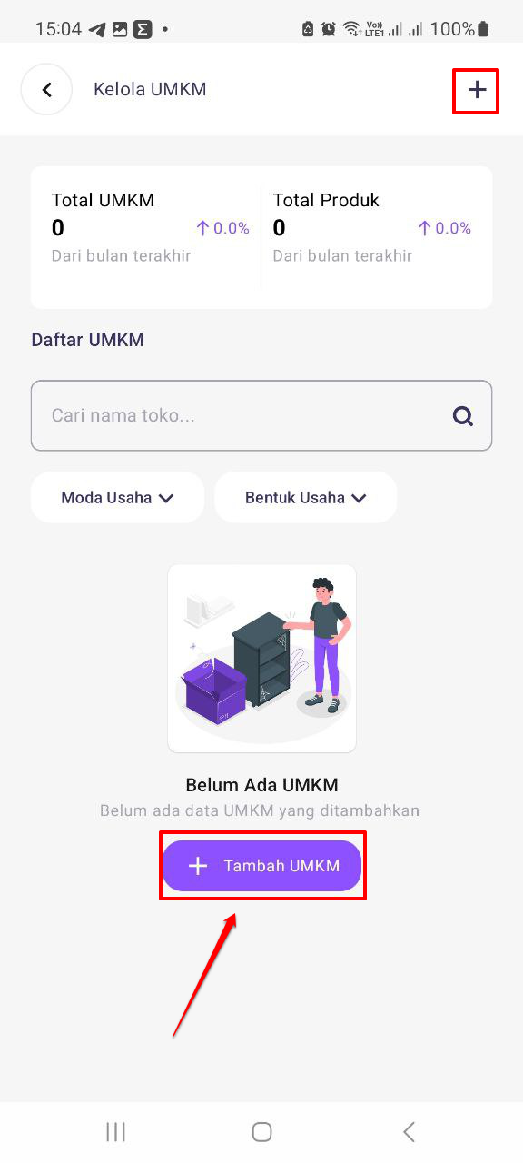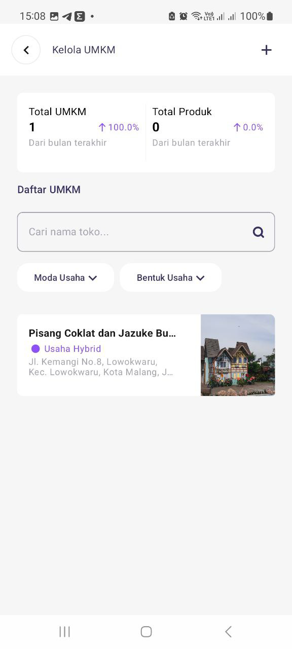 Selanjutnya Anda akan diarahkan pada halaman kelola UMKM, klik tombol Tambah UMKM atau ikon Tambah (+) pada pojok kanan atas halaman tersebut.