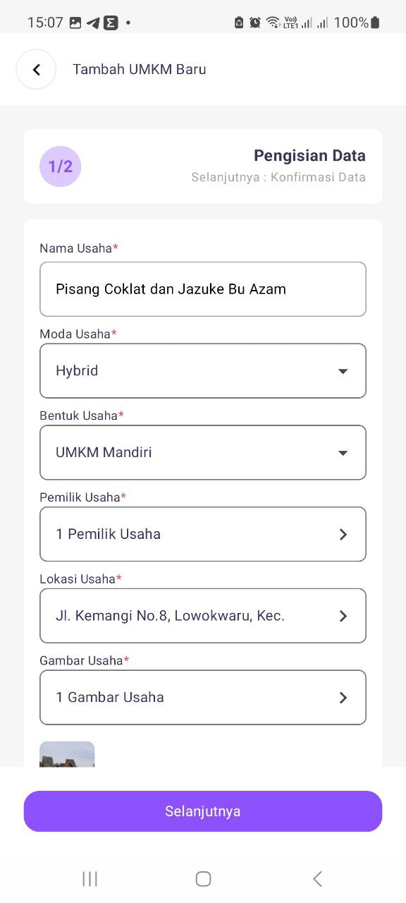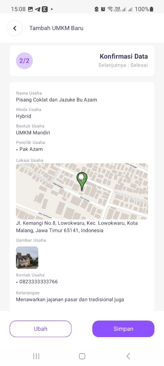 Setelah data UMKM dilengkapi, klik tombol Selanjutnya, cek kembali kesesuaian data UMKM tersebut, jika telah sesuai klik Simpan untuk konfirmasi.