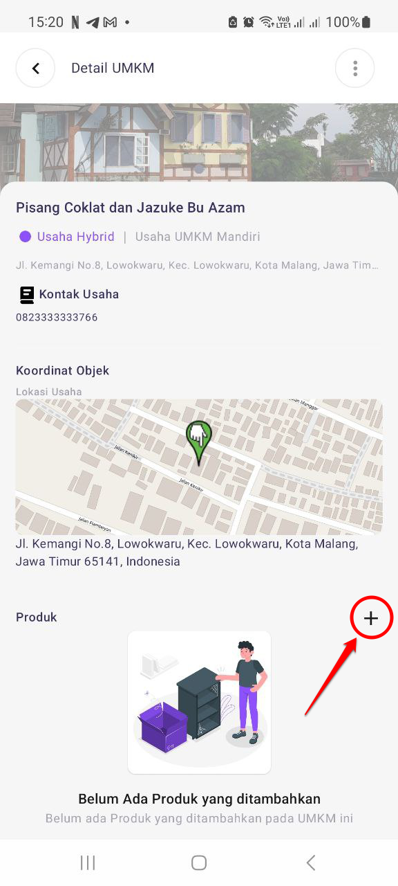 Sistem akan mengarahkan pada halaman detail UMKM tersebut. Klik tombol Tambah (+) pada kolom Produk.
