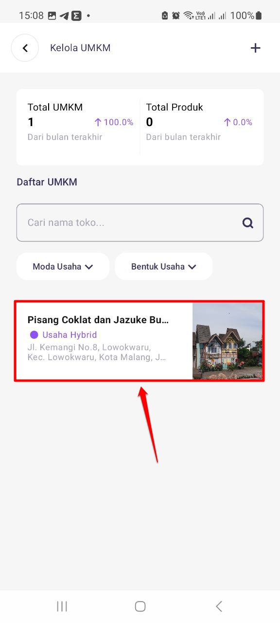 Selanjutnya Anda akan diarahkan pada halaman daftar UMKM. Pastikan Anda telah menambahkan data UMKM sebelumnya. Pilih UMKM yang hendak ditambahkan data produknya.
