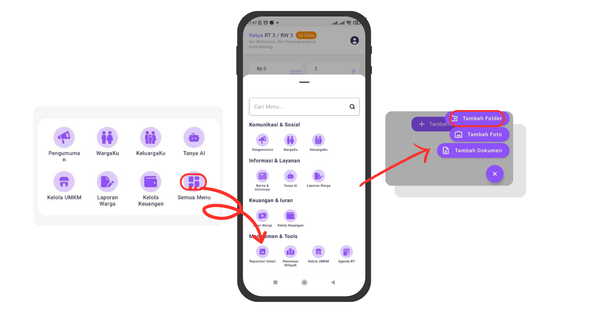 Fitur ini membantu warga dalam mengakses dokumen kepengurusan RT dengan mudah, serta memudahkan pengurus untuk membagikan dokumentasi kegiatan dan informasi penting secara terpusat.